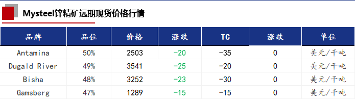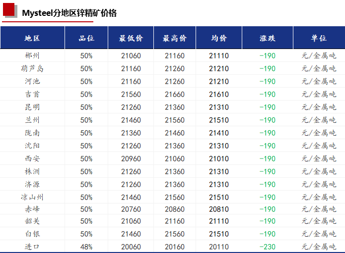 华北地区:内蒙古某锌锭生产企业50品位的锌精矿加工费2450元/金属吨出厂。