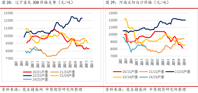 (1)农户心态:由惜售转为悲观。纵观近两年的价格,整体下行趋势明显,2024年2-3月和10-11月均出现了因为惜售价格出现明显反弹的迹象,但是无法改变整体供大于求格局,下行趋势继续,2025年2-3月仍旧面临节后落价,低价惜售的可能,但是目前东北地区节前走货量约1-2成,华北地区走货量约4-5成,整体出货偏低,今年春节提前一个月,按照时间推移,预计卖压将会出现在2月中旬,价格可能会在2月底出现一定反弹,但是随着3月温度升高,农忙开始,市场将从惜售转为销售,市场再度承压。