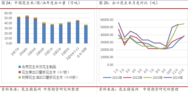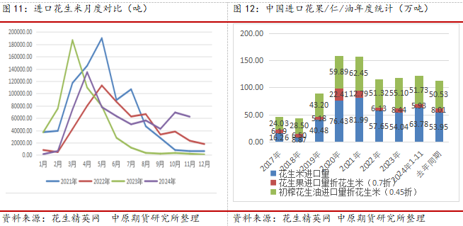 中国花生出口集中在收获季四季度和节后2-3季度,出口主要以去壳花生米及其制品、花生果、初榨花生油为主,出口方向西方和东亚国家为主。整体2024年度看,国内人民币贬值为主,出口相对有利,叠加国内连续两年丰产,价格不断下行,优势明显,2024年1-11月,出口花生米量为42.93万吨,去年同期为34.11万吨,同比增加26%;花生果出口量为2.49万吨,年同期为1.87万吨,同比减少34%左右;初榨花生油出口量为0.96万吨,年同期为0.92万吨,同比减少5%左右;主要集中在去壳花生米及其制品,占国内产量约为5%左右。而进口花生米量为63万吨,占国内产量约7%左右。