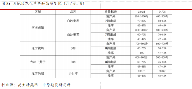 2024年花生生长季,再度出现类似于2022年天气,6月份种植季干旱少雨,主要集中在豫南和鲁东地区,造成花生种植推迟,紧接着在7月份,河南南部和西部地区遭遇洪涝灾害,引发市场对单产的担忧,按照新季花生供应和种植面积推断,整体新季单产出现一定下降,但是通过收获季的走访调研,今年干旱引发的推迟种植反而躲过了洪涝灾害,单产出现下降的同时,出成率和含油率均出现明显的提升,主要集中在大花生产区,预计2024年度花生米单产为365斤/亩,同比减少10%。整体2024/25年度花生产量为1218万吨,同期去年增加2%。