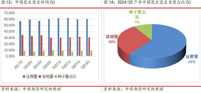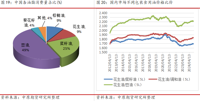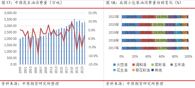 (2)从短周期看,花生油消费具有明显的季节性和地域性,季节性主要集中在节假日走亲访友,单位福利和居家消费方面,花生油消费主要集中在华北黄淮地区、华东和华南经济相对发达地区,目前国内的花生油消费量基本稳定在300万吨左右,2024年预计花生油消费量为330万吨,同比增加2%,北方家庭消费和两广地区餐饮消费成为花生油消费的刚性支撑,2023年,公共卫生事件后,整体社会恢复正常流通,但是受经济下行压力和房地产影响,整体中产收入出现一定影响,家庭消费降级,餐饮消费萎缩,预计整体新年度花生油消费将出现一定程度的滞涨。同时,我们应该看到,2023/2024年度,整体花生油厂去库存压力大,整体库存高位,在新季花生丰产的压力下,预计油厂的库存压力仍旧继续累积,整体花生油的面临上游压力,下游替代的影响,2025年度花生油市场仍将面临去库存为主。