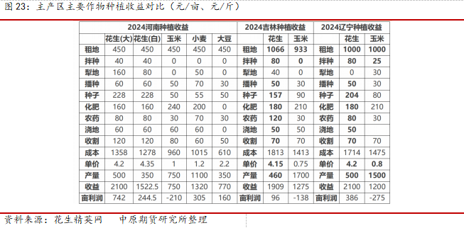 根据价格周期对产能周期的传导,2023年虽然面临种植面积增加,价格下行,存在改种可能但是从定性的角度看,2025年花生从比价还是从种植收益角度均好于玉米和大豆,预计新季花生种植面积仍旧稳中有增,我们可以通过3-4月山东和河南地区种用花生采购和销售情况作进一步的印证,也可以通过4-5月种植意向调研进行跟踪,从今年销售进度上看,华北地区农户节前高价出货量大,而东北地区受水分影响,出货量偏小,可能对明显花生种植面积变化产生一定的变数,但是整体重头在华北地区,预计2025年种植面积继续增加10%左右。