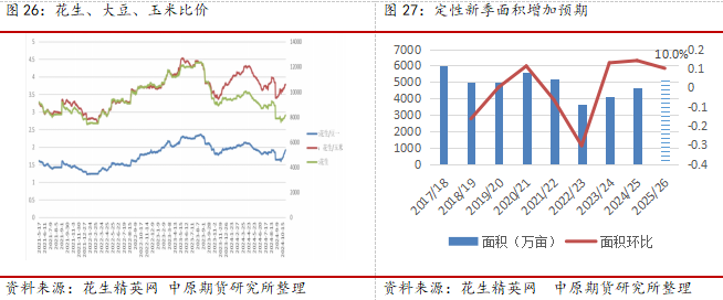 展望2025年度,根据价格周期对产能周期的影响规律,预计面积仍旧呈现增加趋势,主要是基于目前玉米、大豆和花生的比价进行定性的推导,后面我们将进一步做分析,关注3-4月种植意向对新季价格的影响。