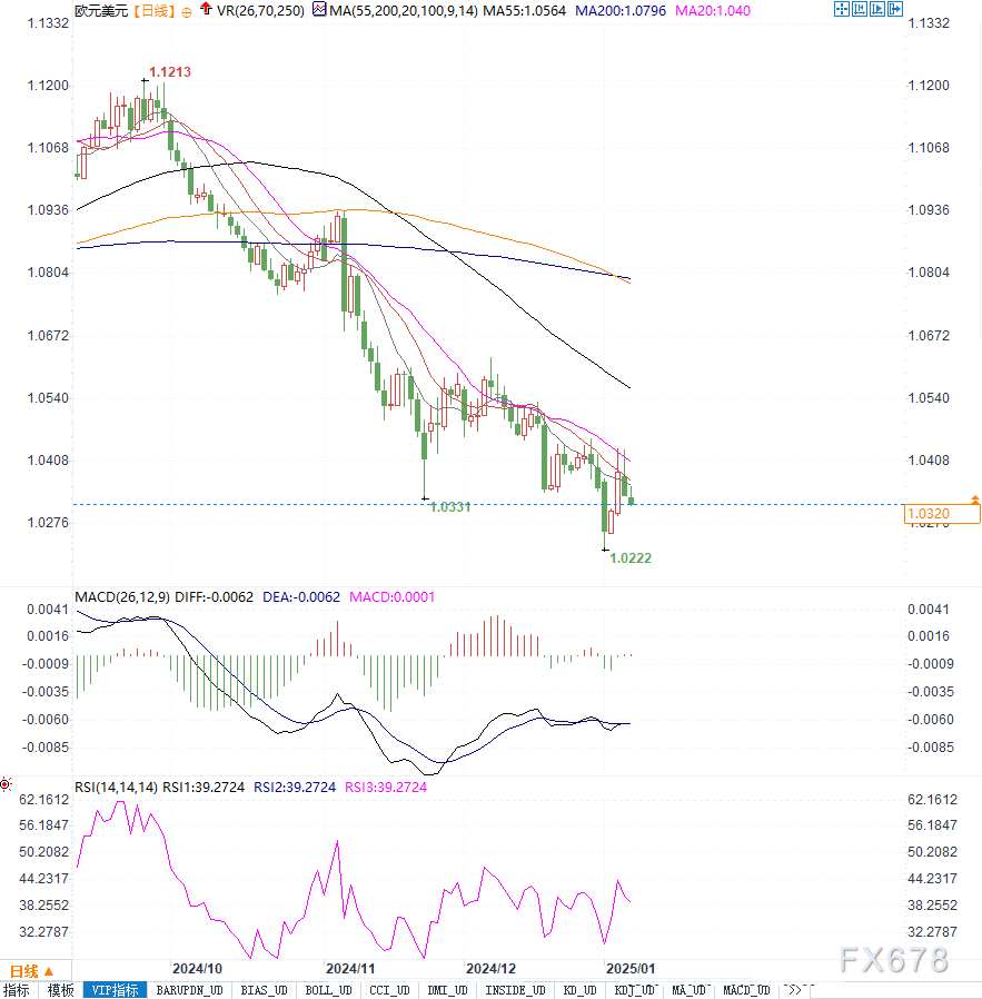 从技术图形上看,欧元/美元仍处于震荡下行趋势中。虽然短期内可能出现技术性反弹,但整体走势偏空,特别是在美元走强的背景下。当前汇价接近关键支撑位,如果跌破这些水平,可能会进一步打开下行空间,测试接近1.0000的平价水平。