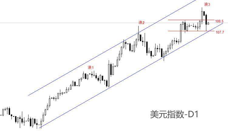 日线级别看,美元指数仍处于上涨通道内部,虽然上周五和本周一大跌,但市价并未穿透下限。波浪理论角度看,最新波段属于浪5范畴,但无法确定浪5是否已经结束。浪5最高点为109.53,处于通道上限以内,未来上涨空间仍存。