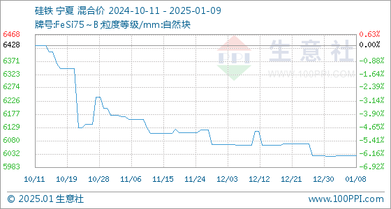 1月9日,生意社硅铁基准价为6025.71元/吨,与本月初(6024.29元/吨)相比,上涨了0.02%。