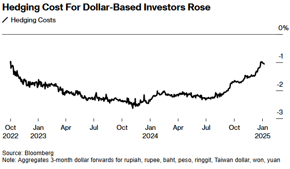 Bloomberg Intelligence驻香港首席亚洲外汇和利率策略师Stephen Chiu表示,“这种对冲成本的增加是暂时的,如果美联储不迅速降息,且与亚洲相比降息幅度不太大,今年这种情况应该会减少。”“这将为拥有亚洲货币敞口的美元投资者提供更低的对冲成本,甚至提高收益率。”