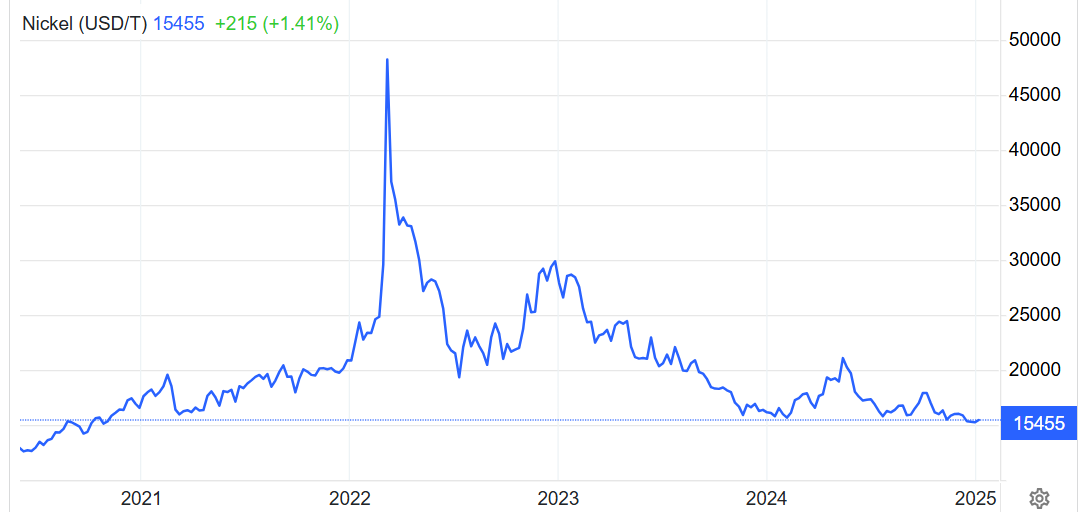 由于印尼近年来镍矿产量激增以及全球范围的电池制造商和不锈钢行业需求大幅减弱,镍金属价格连续两年出现暴跌,自2023年以来价格可谓腰斩。今年,大宗商品领域的交易员们正关注中国政府的经济刺激政策,以及即将上任的特朗普领导的美国政府对外加征关税政策带来的影响,这两大因素将对镍需求层面带来显著影响,进而将影响LME镍金属交易价格。