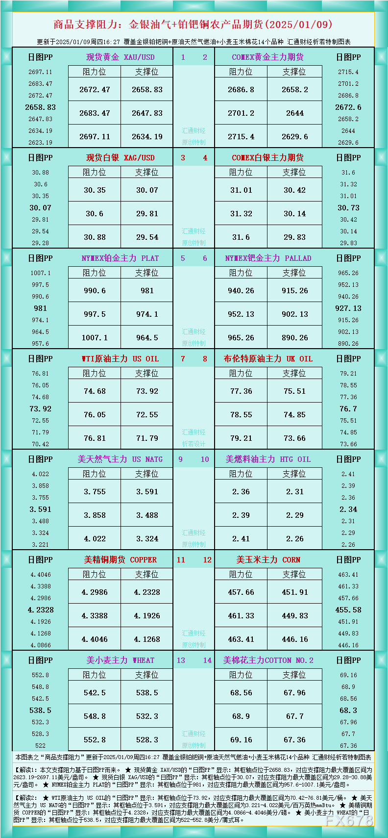 汇通财经APP讯——一张图看商品支撑阻力:金银油气+铂钯铜农产品期货,更新于2025/01/09周四16:27,具体覆盖金银铂钯铜+原油天然气燃油+小麦玉米棉花14个品种,更多详见汇通财经析若特制图表中的内容。