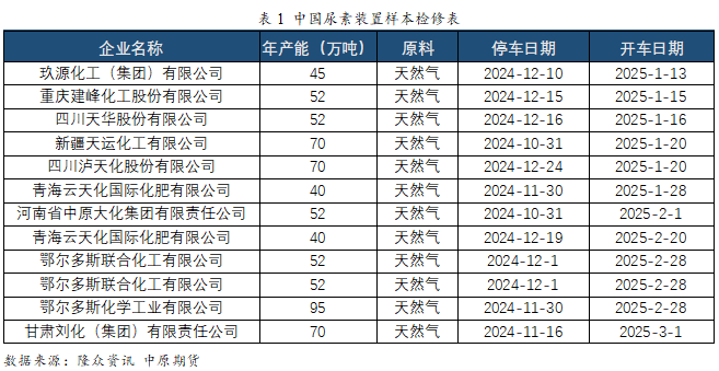 12月份气头尿素企业装置陆续进入检修状态,装置检修损失量达96万吨,供给端总体呈现阶段性减量状态。根据隆众资讯数据,12月尿素行业月均开工率为79.98%,月度产量为559.72万吨,同比增加42.23万吨,装置检修的增加使得供应压力得到一定缓解。从装置检修与复产计划来看,1-2月份多家气头尿素企业装置存复产预期,供应压力预计将进一步回升。库存方面,受尿素企业出货较为缓慢影响,上游尿素企业库存延续累积趋势,累库幅度同比远超往年同期。截至2025年1月2日中国尿素企业总库存量155.08万吨,环比12月初增加13万吨,同比2023年增加158.77%,高库存对尿素近端价格仍然存在较强压制。1月份随着供应压力的进一步回升以及工业刚需支撑转弱,预计尿素企业库存去化压力仍较大。