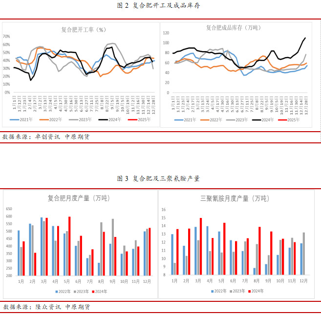 需求端,12月份处于尿素农业需求淡季,需求支撑主要在于储备需求以及复合肥冬储生产的原料采购需求。淡储方面,今年的淡储招标政策内容显示,各月末储备库存量考核更为分散,12月份储备需求以逢低适量跟进为主,对尿素需求支撑力度有限。工业需求方面,12月上中旬复合肥企业开工处于持续提升状态,进入下旬以后产能利用率开始逐步回落,截至2024年12月31日复合肥企业产能利用率为41.34%,当月复合肥产量为522万吨,环比11月份增加126万吨,比去年同期增加1.16%左右。此外受原料价格的持续下跌影响,下游经销商提货心态谨慎,导致复合肥走货持续欠佳,成品库存持续累积至同比高位水平,对尿素原料采购需求较为有限。12月份三聚氰胺产量为12.49万吨,环比增加0.48万吨,同比减少5.45%,月度开工负荷率为57.96,临近年底下游开工陆续下降,三聚氰胺企业出货不畅,开工负荷率同比偏低。出口需求方面,2024年1-11月我国尿素累计出口量为25.96万吨,同比去年降幅93.36%,当前尿素出口仍处于受限状态,需持续关注国内外尿素价差及出口政策情况。后续来看,随着春节假期的逐步临近,复合肥及板材企业开工均处于持续下降状态,尿素下游工业刚需支撑存转弱预期。