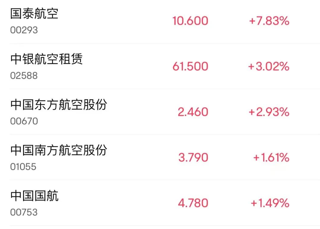 1月9日,港股航空股活跃,国泰航空大涨7.83%,中国东方航空股份涨近3%,中国南方航空股份、中国国航涨超1%。
