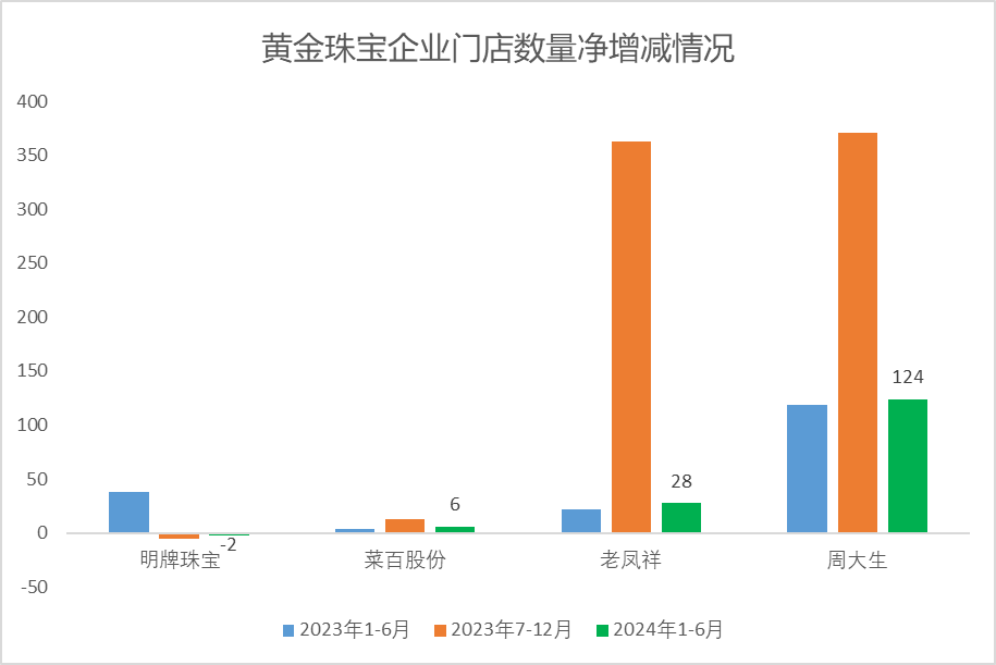 从黄金珠宝上市企业的财报获悉,截至2024年6月末,菜百股份拥有93 家直营连锁门店,较年初净增加6家,增加数量不及2023年下半年的13家,而同期老凤祥的销售网点增加了28家,与2023年下半年的363家相差甚远。此外,明牌珠宝的门店数量在去年上半年净减少了2家。
