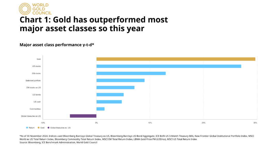 近年来,随着多国央行频频出手增持黄金,国际金价一路上行,屡创新高。截至2024年年底,伦敦现货黄金定盘价为2609.1美元/盎司,较年初的2074.90美元/盎司上涨25.75%,其收益表现优于美国股票、新兴市场股票等其他主要资产。与此同时,各类黄金衍生品交易规模持续放大,黄金俨然成为了过去一年中全球表现最佳的资产种类。