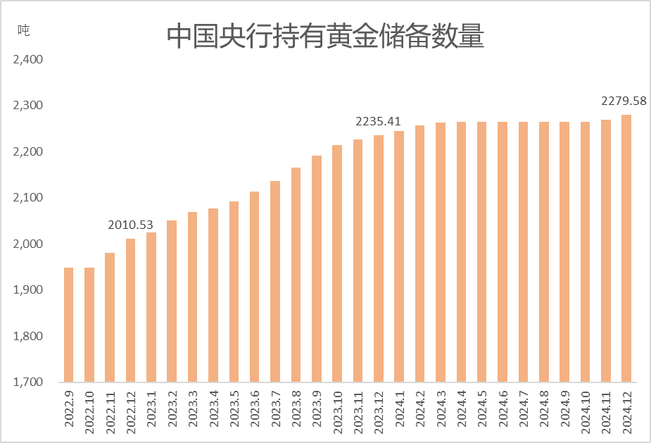 1月7日,我国央行公布了新一期官方储备资产数据,截至2024年末,我国央行持有黄金储备2279.58吨,全年增持44.17吨,这是其连续第三年增持黄金。其中我国央行在2023年增持黄金224.88吨,居于当年全球各国央行增持黄金数量首位。