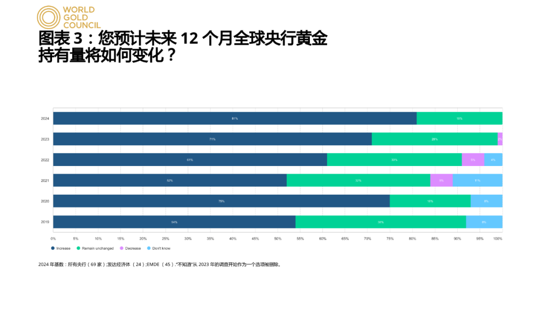 对于未来央行能否保持增持黄金的热情,世界黄金协会在2024年央行黄金储备调查报告中指出,通过梳理70份有效调查回复,有29%的央行受访者计划在未来12个月内增加黄金储备,而这一比例是2018年开始此项调查以来的最高水平。同时这份报告还指出,有81%的央行受访者认为未来12个月全球各国央行黄金持有量将进一步增加。