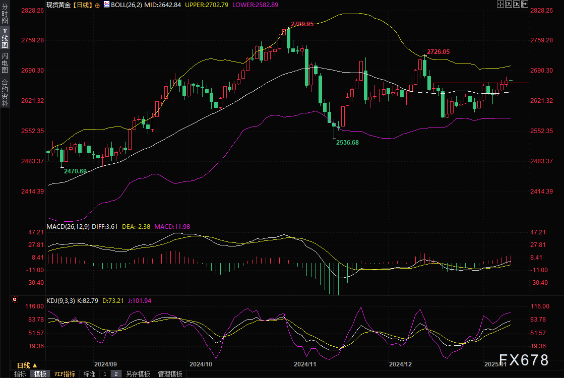现货黄金周四盘中最高触及2678.17美元/盎司,为12月13日以来新高,收报2670.19美元/盎司,日线涨幅约0.33%,为连续三个交易日上涨;技术面来看,MACD金叉,KDJ金叉,金价收盘于过去三周的高点2665上方,后市有望进一步试探布林线上轨2702.76附近阻力。