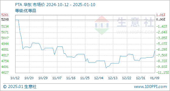 1月10日,生意社PTA基准价为4871.67元/吨,与本月初(4790.00元/吨)相比,上涨了1.71%。