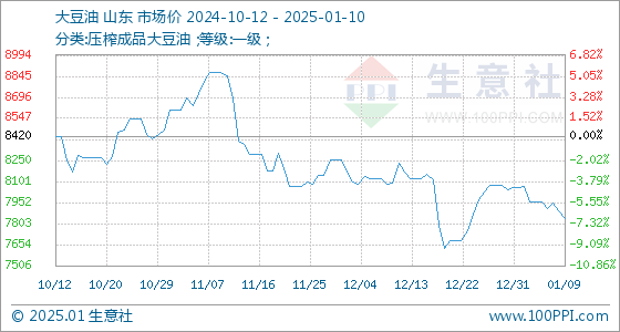 1月10日,生意社大豆油基准价为7836.00元/吨,与本月初(8056.00元/吨)相比,下降了-2.73%。