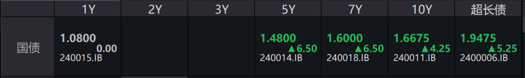 债券市场上,中国5年期、7年期国债收益率日内上行6.5bp,10年期国债收益率日内上行4.25bp,30年期收益率上行5.25bp。