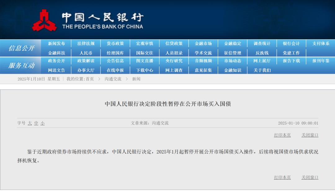 1月10日,中国人民银行发布公告称,鉴于近期政府债券市场持续供不应求,中国人民银行决定,2025年1月起暂停开展公开市场国债买入操作,后续将视国债市场供求状况择机恢复。