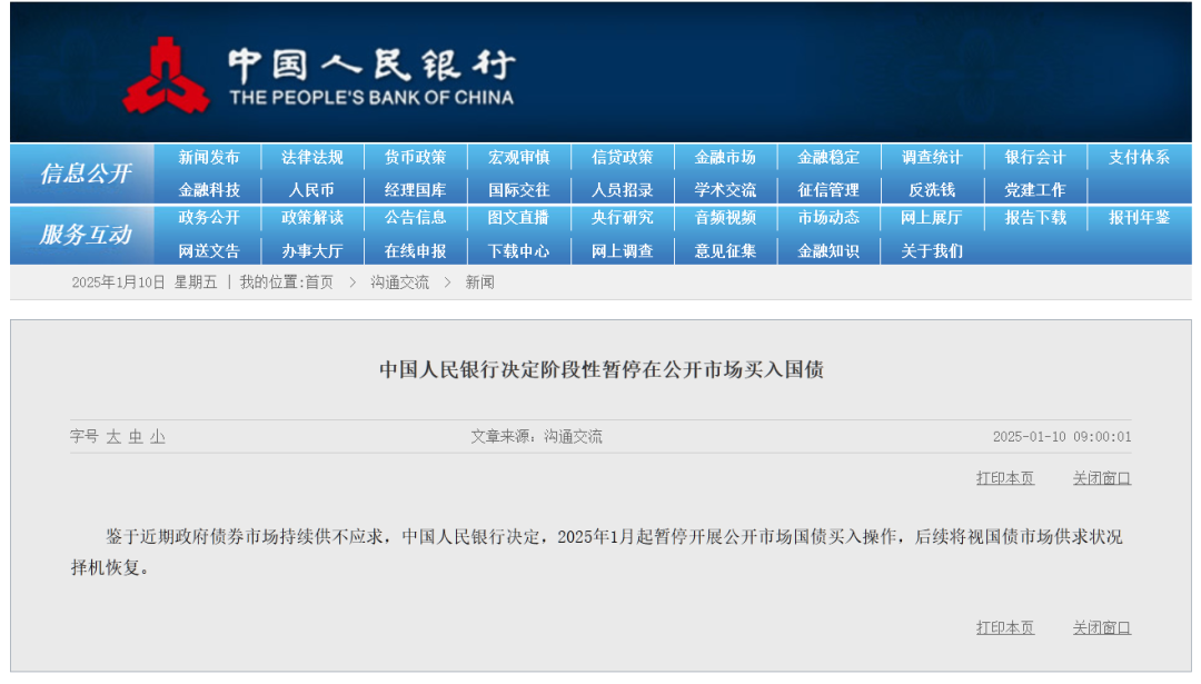 1月10日,据中国人民银行网站消息,鉴于近期政府债券市场持续供不应求,中国人民银行决定,2025年1月起暂停开展公开市场国债买入操作,后续将视国债市场供求状况择机恢复。