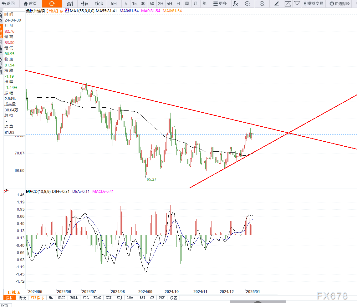且均线缓慢上移,MACD指标继续走高,不排除再次测试下降趋势线的可能性,而基本面上,因美欧冬季供暖需求回升,推动油价走强。
