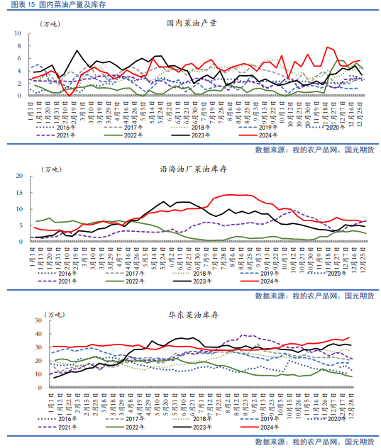 期末库存来看,全球菜籽期末库存:预计2024/2025年度全球菜籽结转库存为783.1万吨,较2023/2024年度减少33.4万吨,库销比为8.87%,处于过去20年中中性偏低水平。