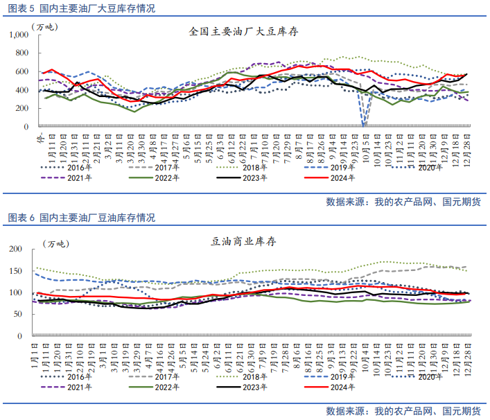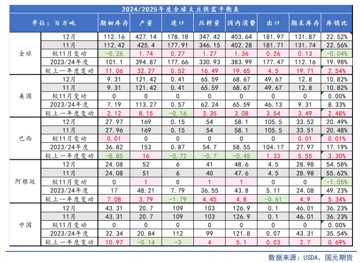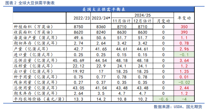 12月中旬,美国农业部发布12月份供需报告,报告调整有限,对市场影响中性偏空。美国农业部在12月的供需报告中保持了对美豆产量、出口、压榨和期末库存的预期不变,反映出市场对美豆丰产的预期依然强烈。具体来看,美豆产量预计为44.61亿蒲式耳,与市场预期的44.7亿蒲式耳相差不大。总消费量环比持平,为43.48亿蒲式耳,而大豆期末库存维持在4.7亿蒲式耳,处于近五年的高位。此外,美国农业部对美豆季节平均价格的预计环比下调了0.60美元,至每蒲耳10.20美元,显示市场对短期内美豆价格的波动预期不大,同时反映出美豆市场供应压力依旧存在。综上所述,美国农业部的报告维持了对美豆丰产的预期,而市场对美豆价格的短期反弹压力未减。