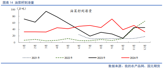 据海关数据显示,2024年11月菜籽进口量为70.79万吨,环比下降16.13%,同比增长46.98%。2024年11月国内菜籽进口量较10月有所下降,但仍保持较高水平,而11-12月的菜籽到港量预计将有所减少,尤其是12月的到港量预计为50万吨。根据中国粮油商务网监测数据显示,截止到2024年第50周末,国内进口油菜籽库存总量为91.2万吨,较上周的100.3万吨减少9.1万吨,去年同期为52.3万吨,五周平均为80.7万吨。截止12月13日,2024年12月、1月、2月油菜籽预估到港量分别为50万吨、26万吨、16万吨。