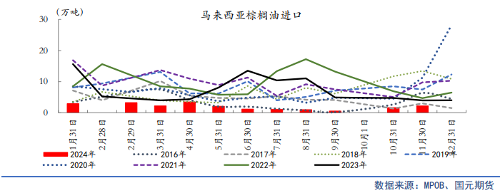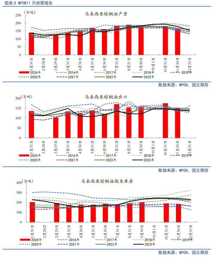 马来西亚棕榈油局(MPOB)月度数据显示,产量:2024年11月,马来西亚棕榈油产量为162.13万吨,环比减少9.75%,同比下降9.37%。这一产量减幅高于市场预期,表明当前处于棕榈油传统减产季节,加之部分区域11月下旬出现强降雨引发洪涝,对生产造成不利影响。数据显示11月棕榈油进口量为2.21万吨,环比增加35.08%。11月棕榈油出口量为148.72万吨,环比减少14.74%。出口下滑幅度高于预期,主要是由于高价格抑制了海外需求,特别是中国等市场需求减弱,洗船情况逐渐增加。11月期末库存量为183.62万吨,环比减少2.57%。尽管库存连续两个月下滑,但去库速度不及市场预期,11月数值处于历史中等水平、低于前两年同期。