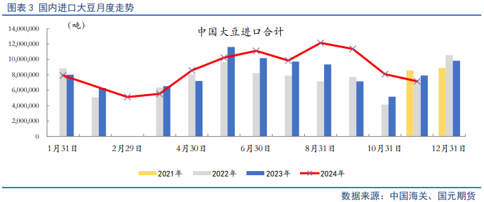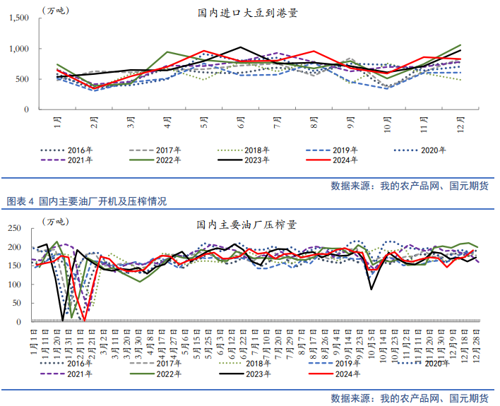 根据USDA 12月报告数据,南美大豆新作的产量预期保持乐观。USDA将阿根廷大豆产量预估上调100万吨至5200万吨,而罗萨里奥交易所预计产量为5300万吨至5350万吨,布宜诺斯艾利斯谷物交易所预计阿根廷大豆产量为5250万吨,均表明阿根廷新作大豆产量前景预期较好。巴西大豆产量预期维持在1.69亿吨不变,截至12月8日,巴西24/25年度大豆播种率为94.1%,显示出播种进度略快于去年同期。这些数据均表明南美大豆生长情况良好,全球大豆供给充裕。