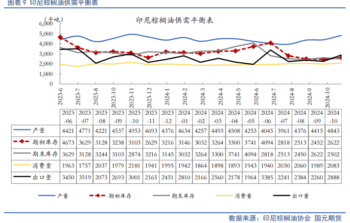 根据印尼棕榈油协会(GAPKI)的数据,2024年印尼毛棕榈油产量预计将达到4800万吨,相比2023年的5480万吨有所下降。印尼2024年棕榈油出口量预计为2950万吨,比去年的3025万吨减少2.48%。此外,受国内需求增长和产量下降的影响,2024年印尼棕榈油出口量可能同比减少200万吨,降至3020万吨。截至2024年10月底,印尼棕榈油库存为251万吨,低于之前一个月末的262万吨,因国内消费量增加。印尼国内棕榈油的消费量增加,特别是在生物柴油方面的使用。2024年10月份,印尼国内消费量为199.5万吨,其中生物柴油对棕榈油的需求达到99.1万吨
