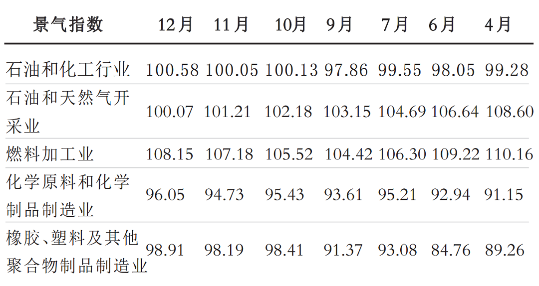 石油和化工行业景气指数由中国石油和化学工业联合会与山东卓创资讯股份有限公司联合编制,是石油化工行业的微观景气循环监控指标,包括“石油和天然气开采业景气指数”“燃料加工业景气指数”“化学原料和化学制品制造业景气指数”“橡胶、塑料及其他聚合物制品制造业景气指数”4个分指数。石油和化工行业景气指数的景气指标选择以度量行业的潜在产出和经济效益为标准,包括生产类微观数据和行业效益类数据,其中生产类微观数据包括产能利用率、产品盈利能力、产成品库存水平。基础数据来源于与千余家企业建立的定期调研评估结果。