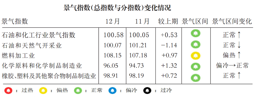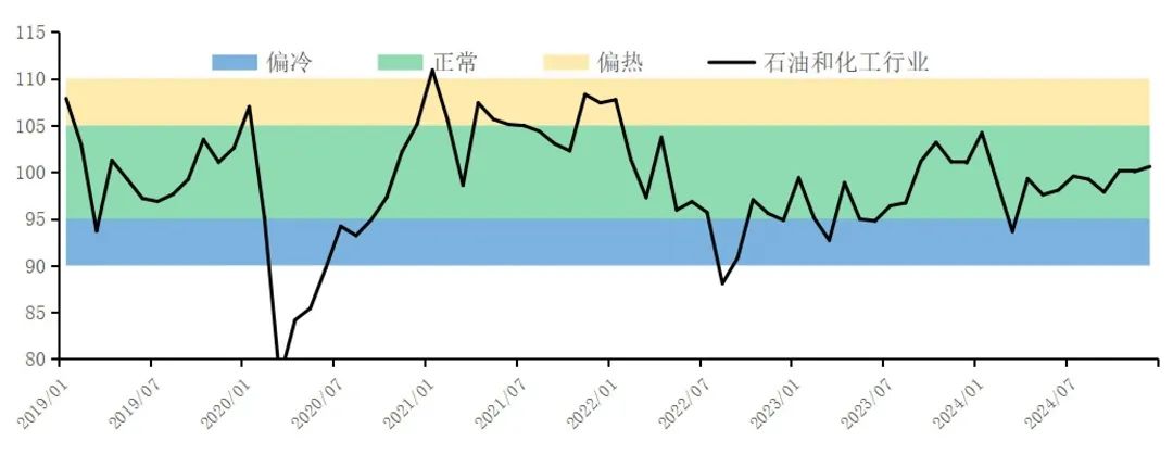 2024年12月,前期低迷的原油价格传导至下游环节,石油和化工行业利润有所修复,推动石油和化工行业景气指数回升0.53个百分点,至100.58。从分指数来看,利润的好转带动化学原料和化学制品制造业以及橡胶、塑料及其他聚合物制品制造业景气指数环比分别上升1.32个百分点、0.72个百分点。其中,化学原料和化学制品制造业景气指数由偏冷区间回到正常区间。然而,终端需求仍然较弱,制造环节开工情况无明显好转,对原油需求减少,叠加近期国内原油进口增加,石油和天然气开采业库存周转速度放缓,景气指数环比回落1.14个百分点。因未出现极寒天气,对燃料需求仍有增加,燃料加工业景气指数环比上升0.97个百分点。