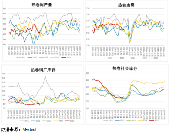 热卷方面,产量略有回升,周增1.15万吨至303.89万吨,略高于2023年同期0.04%。需求方面,季节性转弱,降幅相对平缓,环比下降1.65万吨至301.08万吨,同比较2023年下降0.15%。库存维持小幅增量,周环比回升2.81万吨,其中主要集中在社库的增加7.5万吨,厂库下降4.69万吨,总体库存水平较2023年同期高出1.93%。从季节性规律来看,春节前一周甚至是春节当周热卷需求才会出现明显回落,这与下游制造业停工偏晚有关,而节后复工复产通常也会早于螺纹钢下游工地施工,因此,这一阶段卷螺差往往有走扩的驱动。但需关注关税相关消息对出口市场冲击。