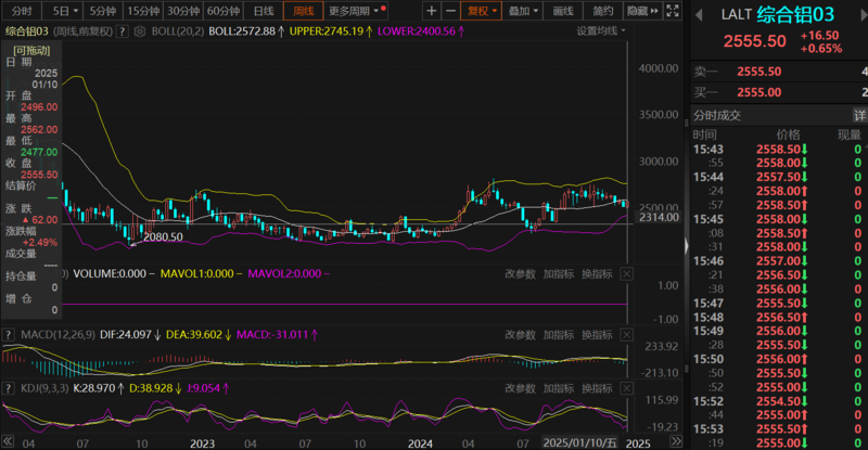 伦铝方面,伦铝本周的走势与沪铝相近,截至15:57分,伦铝以0.65%的涨幅报2555.5美元/吨,周线上涨2.49%。