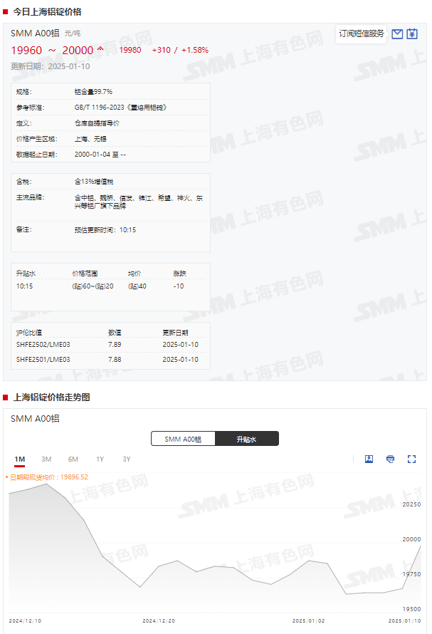 现货方面,据SMM现货报价显示,本周SMM A00铝现货报价整体呈现震荡上行的态势,截至1月10日,SMM A00铝现货报价涨至19960~20000元/吨,均价报19980元/吨,较1月3日的19850元/吨上涨130元/吨,涨幅达0.65%。