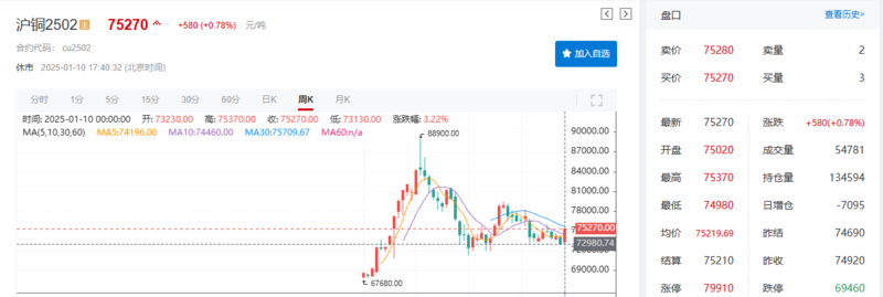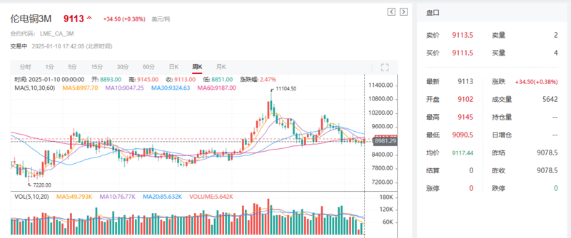 本周周初美元指数回落至108附近后再次涨至109上方,铜库存本周出现去库,随着市场对特朗普上任后的关税和保护主义等政策的担忧情绪渐浓,市场投资也呈现多角度发散的状态,资本市场再次呈现了美元、贵金属以及铜等大宗商品齐舞的局面。受基本面和套利资金涌入等的支撑,铜价本周出现上涨,截至1月10日17:41分,伦铜涨0.38%,报9113美元/吨,其本周周线暂时涨2.66%;沪铜涨0.78%,报75270元/吨,其本周周线涨幅为3.08%。
