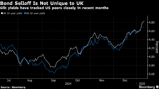 市场对英国的信心比较脆弱,在经济增长趋平、通胀高企、预算案反响不佳的情况下,工党赢得大选后的乐观情绪已经消退。虽然本周下跌是在全球范围内对唐纳德.特朗普关税威胁、债务膨胀和通胀的更广泛担忧之际出现的,但英国资产的走势仍然是残酷的。