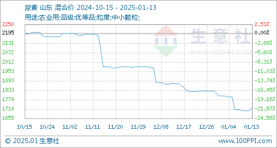 1月13日,生意社尿素基准价为1705.00元/吨,与本月初(1798.33元/吨)相比,下降了-5.19%。