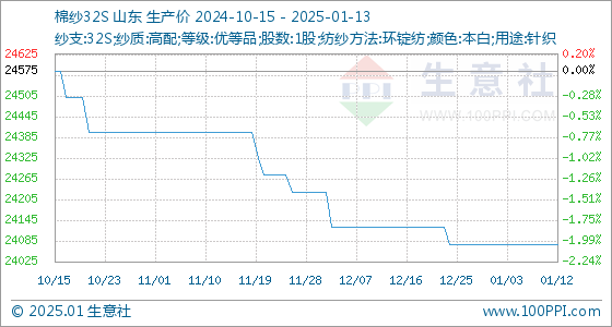1月13日,生意社棉纱32S基准价为24075.00元/吨,与本月初持平。