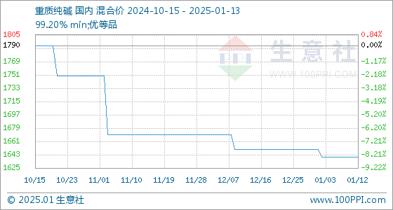 1月13日,生意社重质纯碱基准价为1640.00元/吨,与本月初(1650.00元/吨)相比,下降了-0.61%。