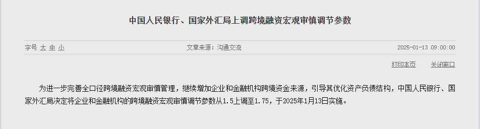 1月13日央行发布公告,为进一步完善全口径跨境融资宏观审慎管理,继续增加企业和金融机构跨境资金来源,引导其优化资产负债结构,中国人民银行、国家外汇局决定将企业和金融机构的跨境融资宏观审慎调节参数从1.5上调至1.75,于2025年1月13日实施。
