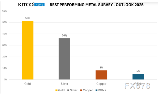 Kitco News 上周收集了 208 名散户投资者的 Kitco News 2025 年顶级金属调查结果,结果显示,超过一半的主流人士预计黄金将在 2025 年再次超过所有其他金属。