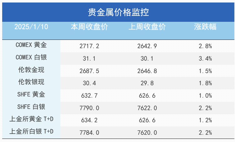 贵金属方面,上周COMEX黄金上涨2.44%,白银上涨3.99%;沪金2502合约上涨1.19%,沪银2502合约上涨2.19%。主要工业金属价格中,COMEX铜、沪铜分别变动+5.24%、+3.22%。