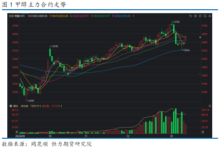甲醇2024年末至2025年初这段时间行情波澜壮阔,前期强势上涨,05合约盘面价格24年底已超过2700点高位。本周来看价格高位回落,截至星期五(1/10日)主力MA2505合约收盘价为2596元/吨。虽然周五夜盘在俄罗斯受美国制裁加剧消息影响下再度冲高,但供需转弱下预计上方空间较为有限,当前情况下做多需谨慎。