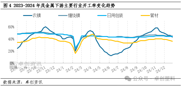 四季度,茂金属下游主要行业开工整体呈现先升后降的趋势,但其开工水平不及去年同期。据卓创资讯统计,四季度农膜行业季度内开工高点在11月初,开工水平为58%,较去年同期低2个百分点,最后其开工进入下滑通道,到季度末总计下滑15个百分点至43%。10月农膜中PO膜需求开始转弱,双防膜订单虽尚可跟进,但支撑力度较小;11-12月,农膜季节性需求逐步消退,需求不断减弱,其中棚膜整体订单跟进明显放缓,开工逐步下滑,地膜虽有部分招标订单开启,但其对茂金属原料带动有限。其他下游行业需求无明显改善,订单跟进乏力,开工所维持淡稳为主,原料采购情绪谨慎,逢低小单拿货坚持刚需,整体需求端难起有效支撑。