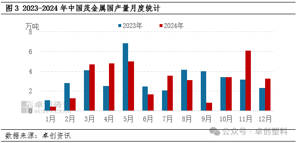 据卓创资讯数据统计,2024年四季度国内石化茂金属聚乙烯累计产量在12.78万吨,环比增加71.38%,同比增加44.06%。四季度国内无新增茂金属聚乙烯产能,期间由于部分生产企业为完成年度计划任务,增加了茂金属聚乙烯的排产比例,茂金属聚乙烯产量增加显著。特别是在11月份,广东石化、独山子石化以及兰州石化30万吨/年新全密度装置排产茂金属聚乙烯产品周期均有所延长,11月份月产量可达6.09万吨,同比提升93.35%,位居首位。