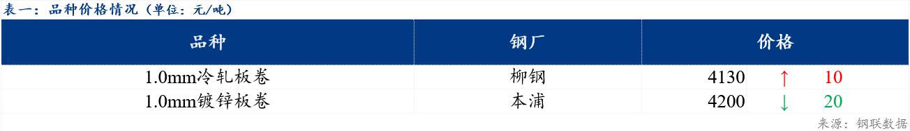 今日冷轧板卷乐从与天津价差较上一交易日扩大10元/吨,乐从与上海价差较上一交易日扩大10元/吨;镀锌板卷乐从与天津价差较上一交易日扩大20元/吨,与上海价差较上一交易日收窄20元/吨。品种价差方面,镀冷价差较上一交易日收窄30元/吨,镀热价差较上一交易日收窄50元/吨,冷热价差较上一交易日收窄20元/吨。